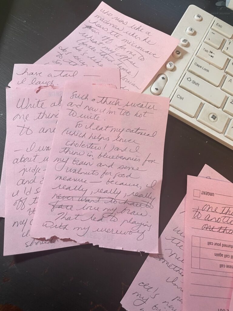 I couldn’t find any paper by the window seat so I picked up a book that didn’t hold my attention. But there, underneath the book, was a little pad of pink memo sheets I thrifted from somewhere. Eureka! It had to do as the words were spilling and I needed something to catch them.